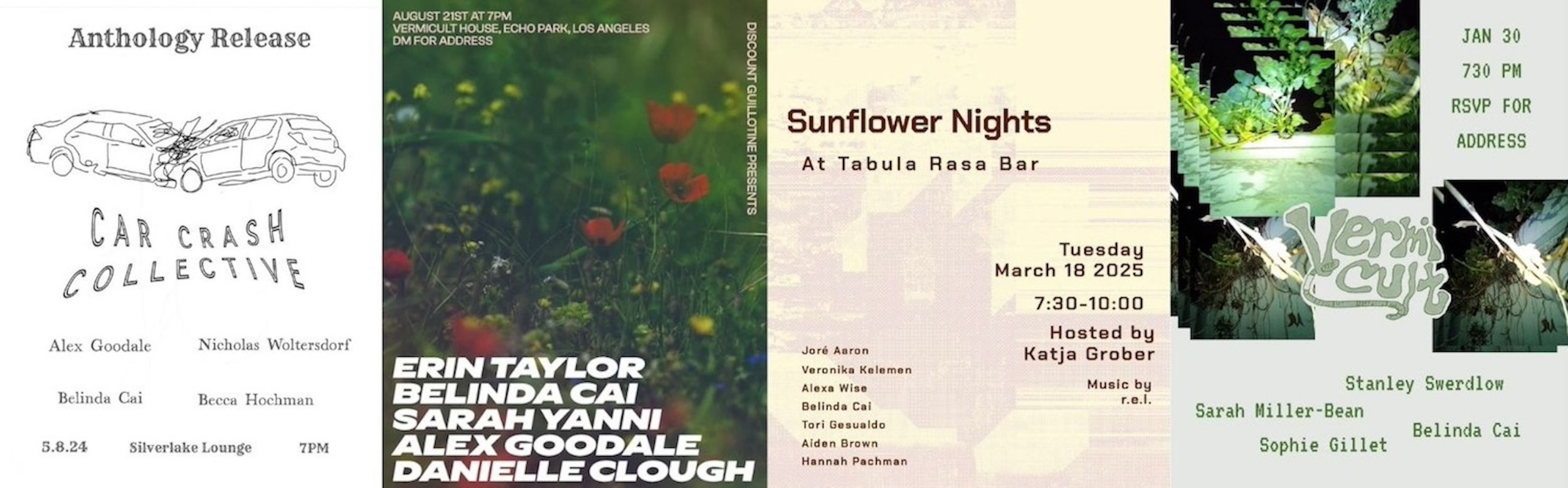 -Live readings of my work for Car Crash Collective, Discount Guillotine, Sunflower Station Press, Midcult, Vermicult, High Femme, book releases, and more. (ongoing)