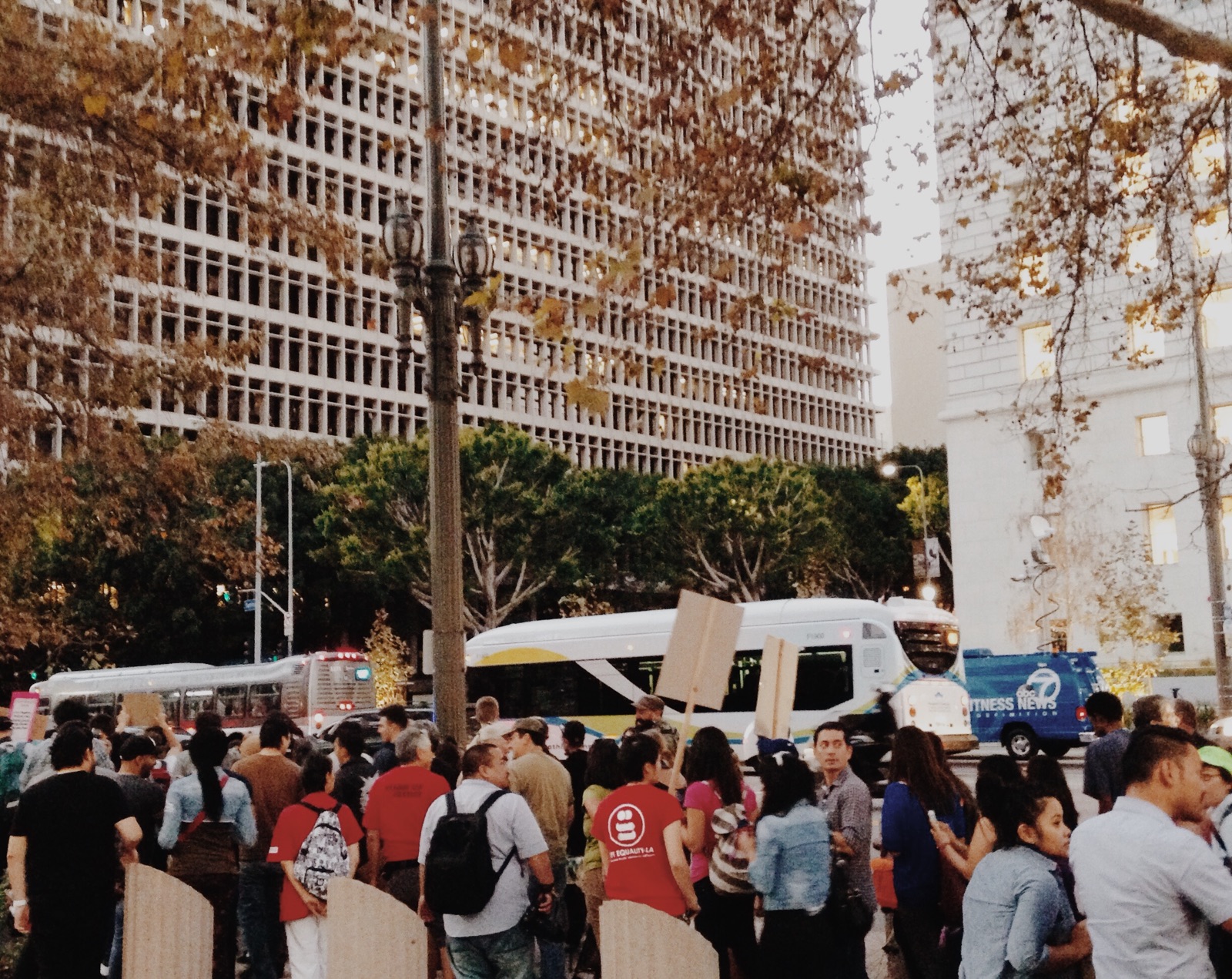 It has been just two days since the Ferguson grand jury decided to not indict Darren Wilson, but marches and demonstrations have become an almost familiar sight in Los Angeles, with drivers honking to show their support. Protesters from all over L.A. stood in front of the courthouse with signs calling for justice for victims of police brutality.